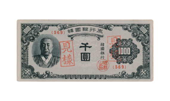 1950年6月12日韩国银行设立后仅仅13天,6·25战争爆发,7月22日在避难所大邱发行了委托日本制作的韩国银行券千圆券和百圆券。千圆券印有李承晚总统画像,百圆券印有光华门图案。