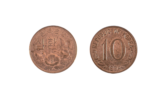 1962年货币改革后为小额交易特别许可制造了以代替“圜”标识的硬币,五十圜币,十圜币,于1966年8月首次发行了十元币,五元币,一元币3种“(韩)元”硬币。十元币印有多宝塔,五元币印有龟船,一元币印有木槿花图案。
