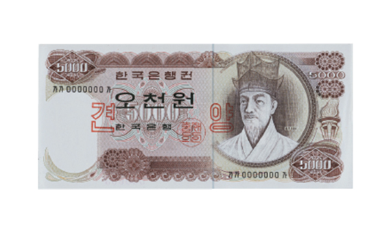 韩国经济快速发展,经济规模扩大的同时,大额券发行迫在眉睫。韩国银行于1972年7月发行五千元券(子),1973年6月发行万元券(子),1975年8月为交易方便发行中间面额千圆券(子)。当时由于没有标准的先贤画像,每个人物的画像有多种版本。在细致的考证后以标准画像作为货币图案,于1977年6月发行五千元券(丑),1979年6月发行万元券。