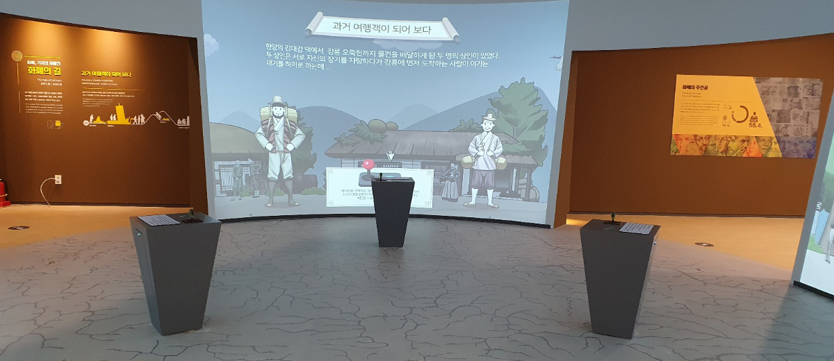 朝鮮の旅人二人が漢陽の漢江船着き場から江陵の烏竹軒へと旅に出ました。物々交換を利用した旅人と貨幣を利用した旅人のうち、どちらがより便利で楽しい旅できたでしょうか?それぞれ異なる交換手段を選択した旅人の旅情をゲームを通じ比較することで貨幣の価値を再確認することができます。
